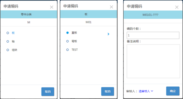 在上圖中最右邊一頁是當所有的碼段都已經設置完畢后出現的申請頁面,可以輸入申請的編碼的個數和原因,如果申請需要審核在這個頁面可以選擇審核人。