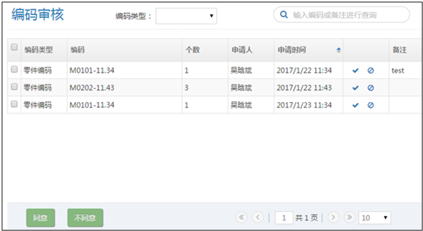 編碼審核就是對提交上來的編碼申請進行判斷是否允許申請者使用的過程。一般是有企業的管理人員擔當審核這樣的角色。該功能點沒有太多的概念,僅僅就是一個列表顯示所有需要操作這審核的編碼申請,點中后進行“同意”“不同意”操作,頁面如下圖所示。